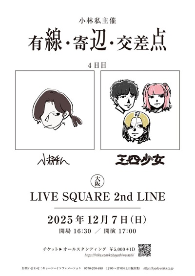 小林私 のライブを見るのは2回目くらいかな? 歌詞を聞いてると『 メッチャ頭の回転が速そうやけど、速過ぎて人とは合わなくて孤高なんやろか?ネット内が居場所? 』な印象。 その感情が赴くままに歌う姿 ” 吶喊 ” ってワードが思い浮かんだ。 「 金平糖 」って曲が良かったー! エキセントリックさと繊細さが共存してる感じ。 あとね、ギターの出音が良くてねー!あまりアコギには詳しくないんで下手なことは言えないけど、そもそもの胴鳴りが良い?音作りが上手い?ピッキングの妙?理由は分らんのやけど、かなり低音域が太くてフラメンコギターみたいな鳴り方してた。 実際、ピッキングは上手くて、歌詞に沿ってピックを浅く入れたり深く入れたり、角度を変えて、ボディを鳴らして・・と弾き語りシンガーも使う手法なんやけど、それを1音1音レベルで行ってて目で追っちゃった! 一瞬『 バンドサウンドで見たいかも? 』と思ったが、曲を聞くにつれワシの考えが安直だった事に気付く。 これで成り立ってるし、他の音に合わせるのは難しそうだし、充分に存在感あるしね! 本編終了後、2マン相手の 三四少女 を呼び込んでのセッションを行ってたが、自分の曲でも有名曲のカバーでもなく 三四少女 の「 たのしいさんすう 」をカバーしてた! 全曲を聞いた訳ではないけど・・歌詞の内容だと M1LKYWAY、演奏面だと 徳永由希 との対バンは面白そう!
