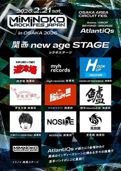 先日に発表されましたが、26年2月21日@アメ村周辺サーキット「 MiMiNOKOROCK FES JAPAN in 大阪2026 」内の【関西 New age STAGE】に当店枠として、1バンド出陣してもらう事になりました! 実は、これまでも色んなサーキット主宰者さんから「 一つのライブハウスを担当してもらえないですか? 」ってオファーを頂く事がありましたが、基本的に全てお断りさせてもらってました。 その断る理由ってのはただ一つ!! 担当しちゃうと、どうしても自分の選んだアーティストのライブに板付きになっちゃって、全く他のライブを見る事が出来ないから! 今回に関しては「 1枠 」って事だったので、有難くオファーを受諾させてもらいました。 どのバンドを出陣させるのか!?は、日々このブログを読んで頂いてる方ならピン!と来るはず。 発表までお待ちください。