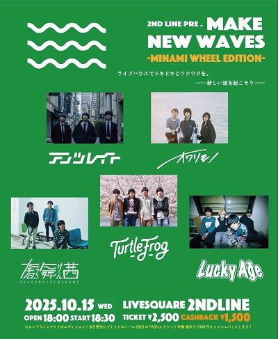 日が明けて、今日も2ndLINEは ミナホ の余韻って事で、ブッキングイベント「 MAKE NEW WAVES -MINAMI WHEEL EDITION- 」が行われてました。 今年は ミナホ に出演が叶わなかった関西の若手バンド+ミナホに出演していた沖縄バンドな組み合わせ。 ライブを見たのは後半2組、沖縄からツアーで来阪している 奢る舞けん茜( しゃるまいけんあかね )→ 京都の アンツレイト でした! 両組とも初めてライブを見る。