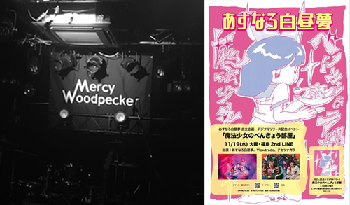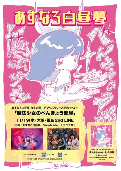 晩からは、2ndLINEで行われている あすなろ白昼夢 pre. 魔法少女の勉強部屋 を見に行く! ライブを見たのは・・トリ前の チセツナガラ ~ あすなろ白昼夢 の2バンド。 チセツナガラ は、今年の「 MINAMI WHEEL 25 」でもライブ( 入場規制 )を見たけど、フロアの反応を見る感じだと集客力がアップして来てるのが分かるね。 ちゃんと楽曲を知った方達が来てるのが「 ファンタジーオーバードーズ 」辺りの盛り上がり方を見ると分かるね。 元々、演奏力に関して折り紙付きなので問題ないが、個人的には魅せ方・ステージングかな? 楽曲的に捻くれてて妖しげでダンサンブル!な初演の方達の印象だと思うけど、フロント3人の内で誰かが狂気な見せ方が出来ればなぁー・・なんて思う。 Gt.磨見君もBa.まゆちゃんも演奏で魅せて行くタイプなんで、やはりVo.Gt.小唄ぺこ君に頭のネジを2本ほど緩めてもらうのが良いのかなー? 暴れると言うより、存在感やカリスマ感かな? 癖のある楽曲や演奏力は高いクオリティがあるので、誰かがそうなってくると初見さんをガッツリ引き付ける事が出来るのになー。