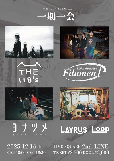 閉店後は、2ndLINEで行われている THE 118’s pre. 一期一会 を見に行く。 ライブを見たのは・・フィラメント の後半 ~ ヨナツメ ~ LAYRUS LOOP ~ THE 118’s の4バンド。 特にトッパーの フィラメント は、本日を含め残り3回のライブで活動休止しちゃうので、1~2曲だけでも見ておきたかったのです。